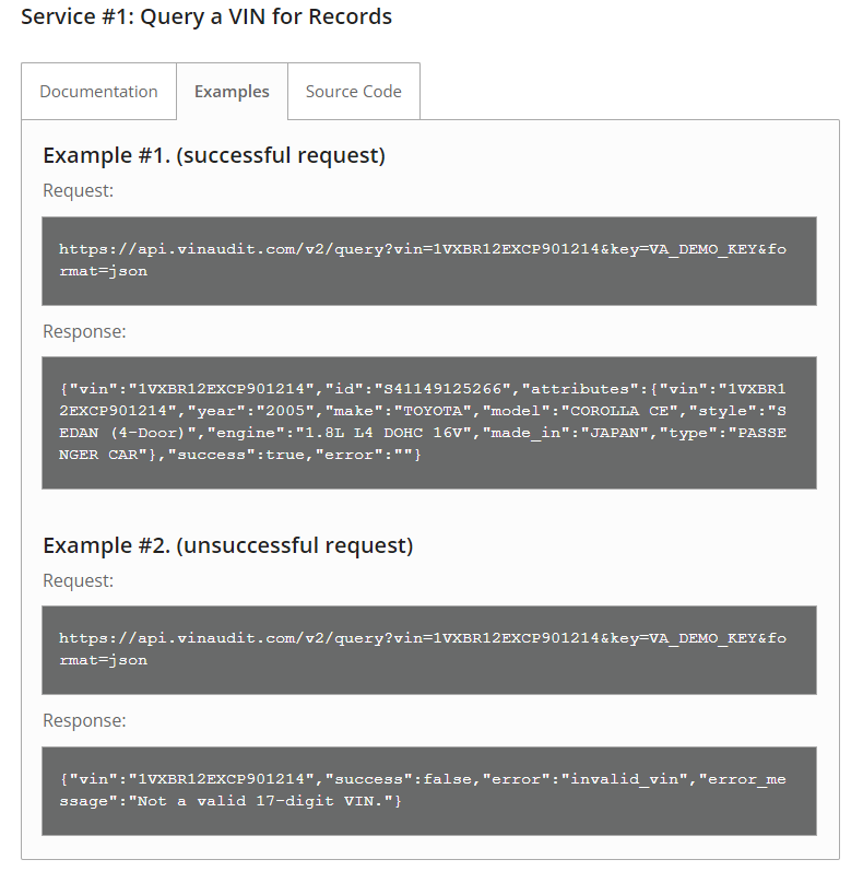 - Formats: Check which formats are available so that you can decide on the data format you want to use. The output through VinAudit’s Vehicle History API, for instance, can be formatted in JSON, XML, or downloaded as a PDF.