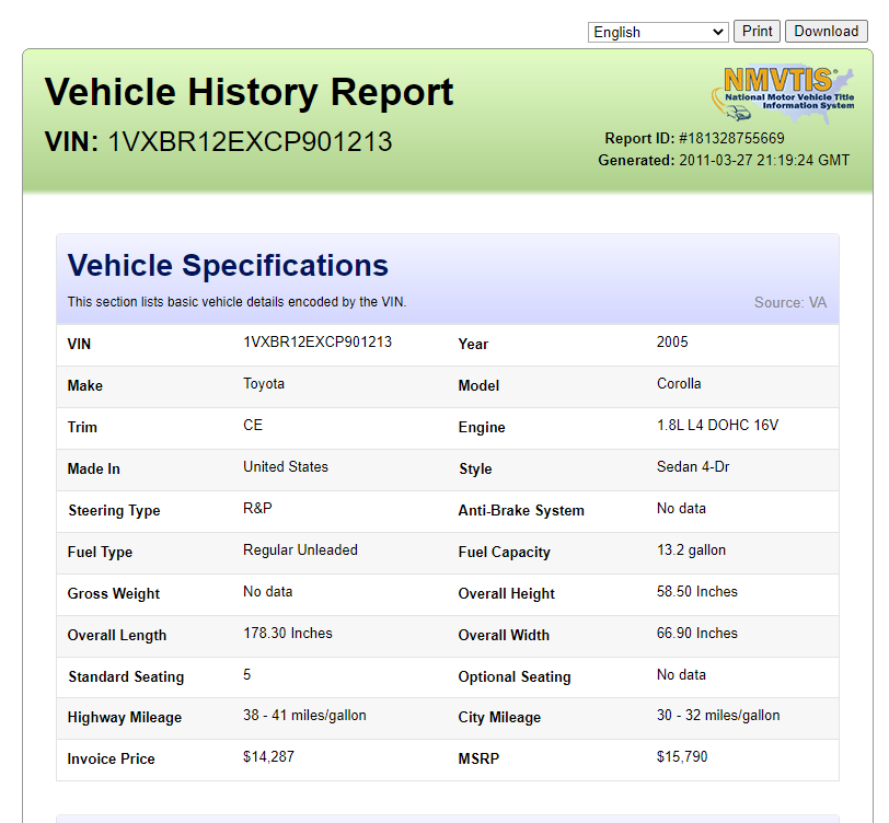 The National Motor Vehicle Title Information System or NMVTIS is a database that provides vehicle history information to consumers, businesses, and government agencies. An NMVTIS report provides data on five key indicators associated with auto fraud and theft prevention: current state of title and last title date, brand history, odometer reading, total loss history, and salvage history. The NMVTIS is the only database that receives reports from DMVs, insurance carriers, salvage yards, auto recyclers, and junkyards regularly as required under federal law.