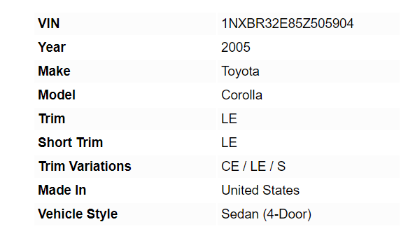 “vin”:”1NXBR32E85Z505904″, “format”:”json”, “include”:”selections,attributes”} |